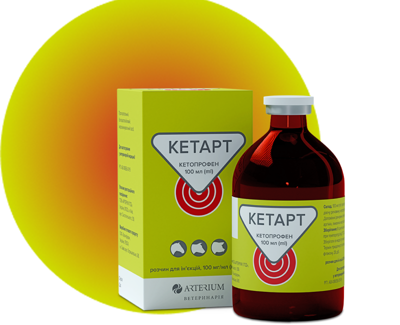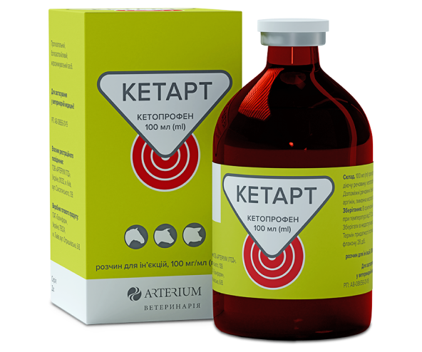 Література *1 Листівка-вкладка препарату Кетарт, розчин для ін’єкції. *2 Звіт клінічного дослідження « Порівняльне дослідження фармакокінетики лікарського засобу ветеринарного призначення кетопрофен 10 % розчин для інʼєкцій , по 100 мл. у флаконах, (Кетарт), виробництва АТ « Галичфарм» та Ріфен, виробництва Ріхтен Фарм АГ, Австрія на телятах. *3 Звіт клінічного дослідження « Порівняльне дослідження фармакокінетики лікарського засобу ветеринарного призначення кетопрофен 10 % розчин для інʼєкцій , по 100 мл. у флаконах, (Кетарт), виробництва АТ « Галичфарм» та Ріфен, виробництва Ріхтен Фарм АГ, Австрія на свинях. *4 Журнал Тваринництво Ветеринарія, порівняльне клінічне дослідження на телятах Л. Крюкова. Реклама ветеринарного препарату. Рекомендовано проводити лікування в домашніх умовах після консультації з ветеринарним лікарем. Інформацію наведено в скороченому вигляді, повна інформація викладена в листівці-вкладці препарату Кетарт, розчин для ін’єкцій. РП: АВ-08656-01-19 від 12.07.21 до 05.08.2024. Власник РП: ТОВ «АРТЕРІУМ ЛТД», 01032, м. Київ, вул. Саксаганського, 139, Україна. Виробник: АТ «Галичфарм», Україна, 79024, м. Львів, вул. Опришківська 6/8.